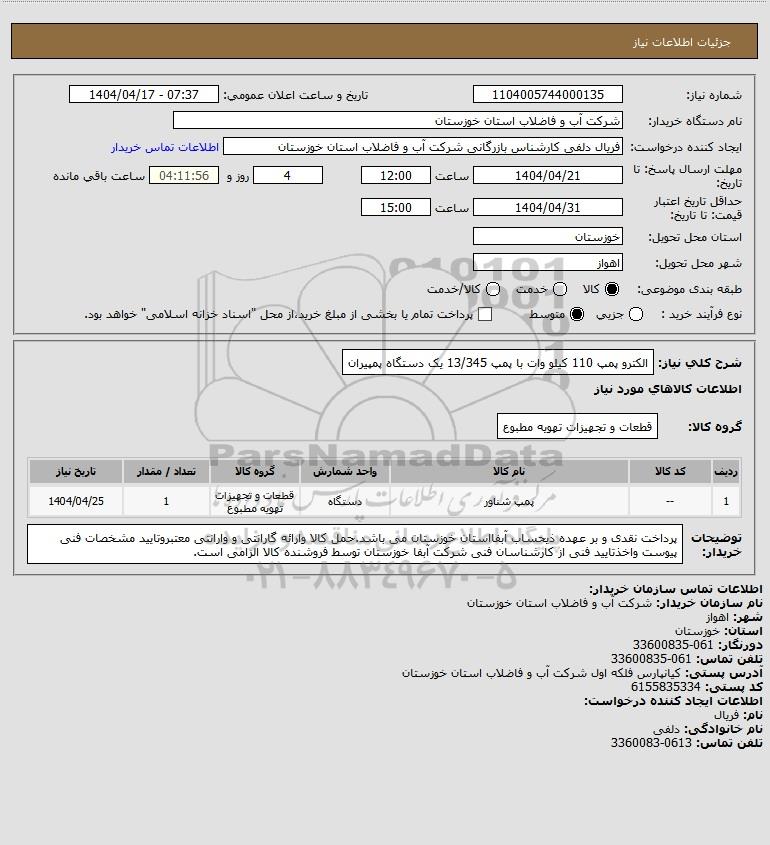 شرح کلی نیاز: الکترو پمپ 110 کیلو وات با پمپ 13/345 یک دستگاه پمپیران