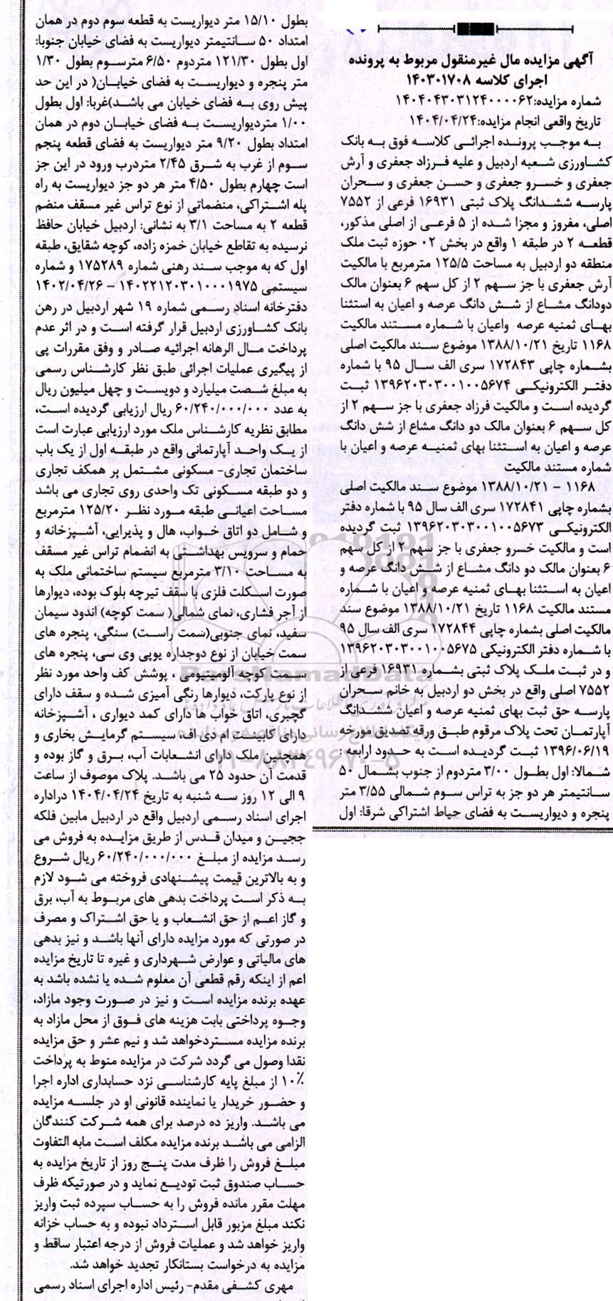 مزایده ششدانگ پلاک 16931 فرعی از 7552 اصلی