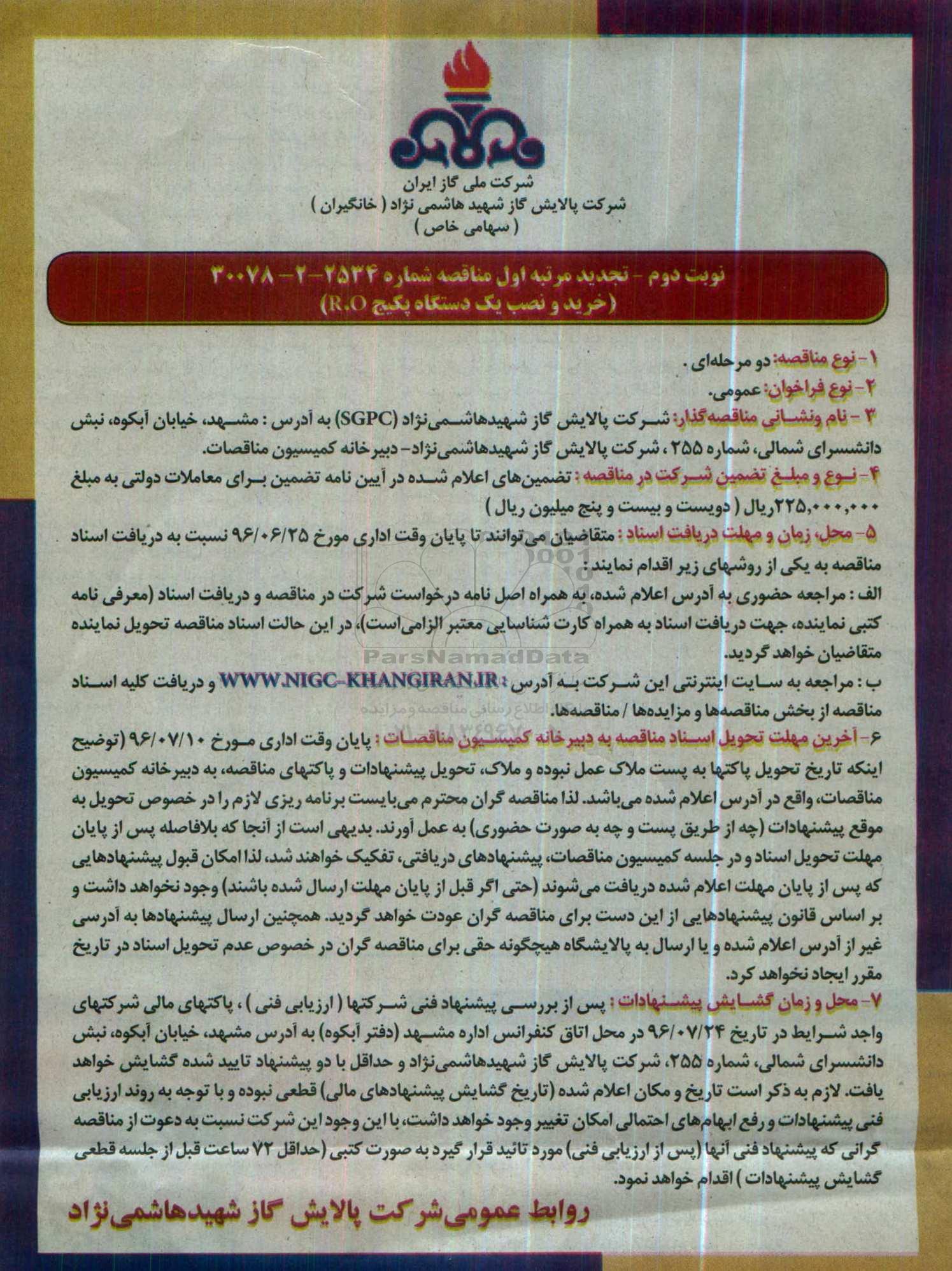 مناقصه خرید و نصب یکدستگاه پکیج R.O تجدید نوبت دوم مرتبه اول 96/6/8 از کلیه افراد متخصص و شرکتها واجد شرایط دعوت به عمل میآید در مناقصه با کد خبرگزاری پارس نماد: 924105 شرکت نمایند.