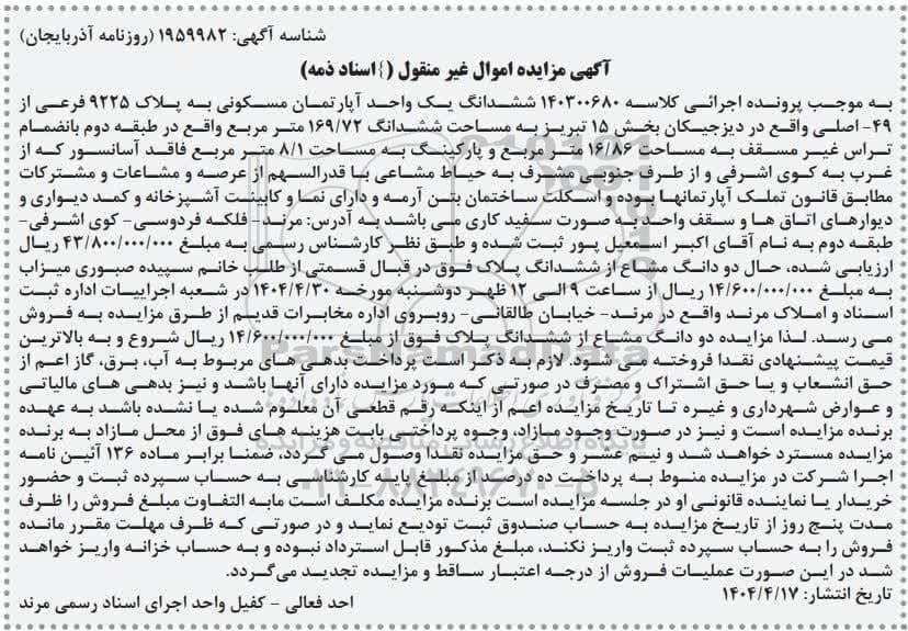مزایده یک واحد آپارتمان مسکونی به پلاک 9225 فرعی از 49 اصلی