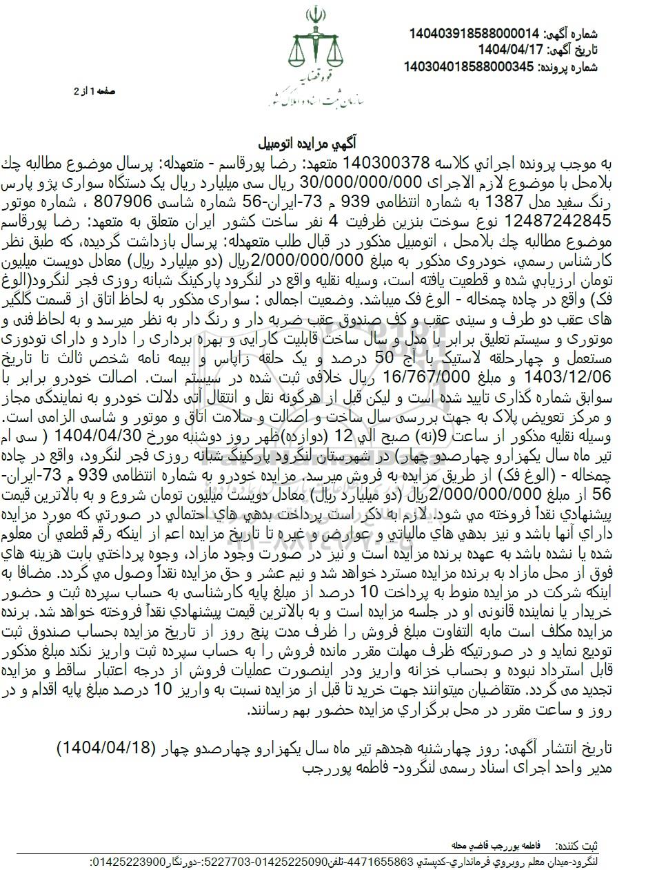 موضوع مزایده : یک دستگاه سواری پژو پارس به رنگ سفید مدل 1387 به ارزش 2.000.000.000 ریال