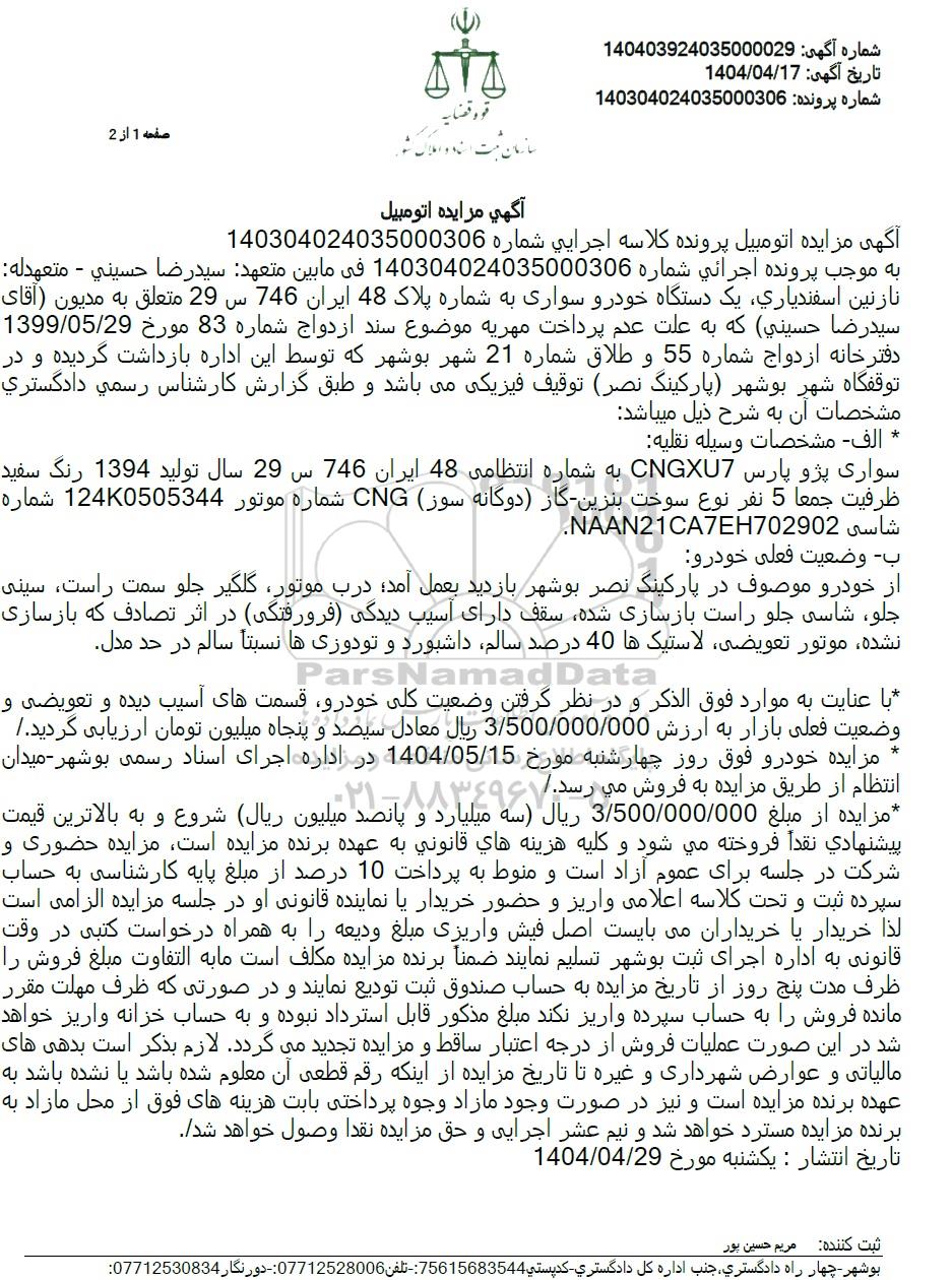 موضوع مزایده : یک دستگاه سواری پژو پارس مدل 1394 به رنگ سفید به ارزش 3.500.000.000 ریال