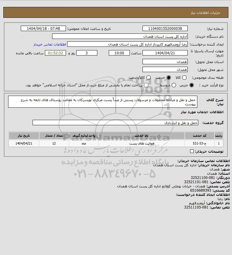 شرح کلی نیاز: حمل و نقل و مبادله محمولات و مرسولات پستی از مبداً پست مرکزی تویسرکان به مقاصد روستای های تابعه به شرح پیوست