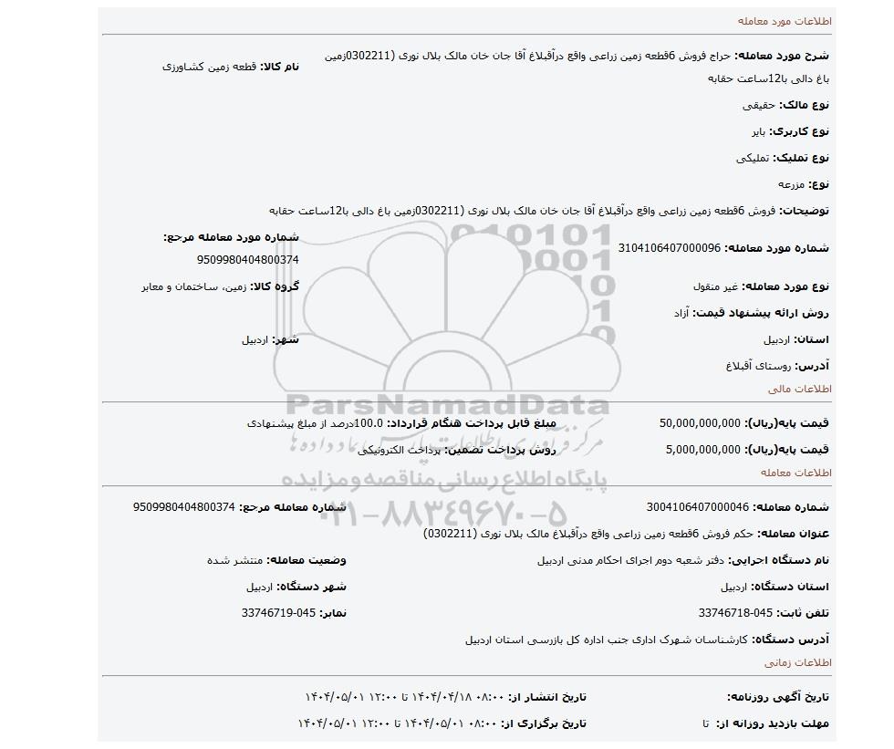 عنوان معامله: حکم فروش 6قطعه زمین زراعی واقع درآقبلاغ مالک بلال نوری (0302211)