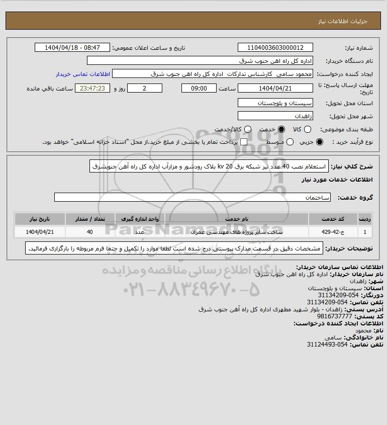 شرح کلی نیاز: استعلام نصب 40 عدد تیر شبکه برق 20 kv بلاک رودشور و مزارآب اداره کل راه آهن جنوبشرق