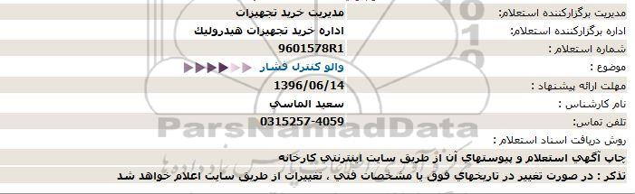 اداره برگزارکننده استعلام: اداره خرید تجهیزات هیدرولیک