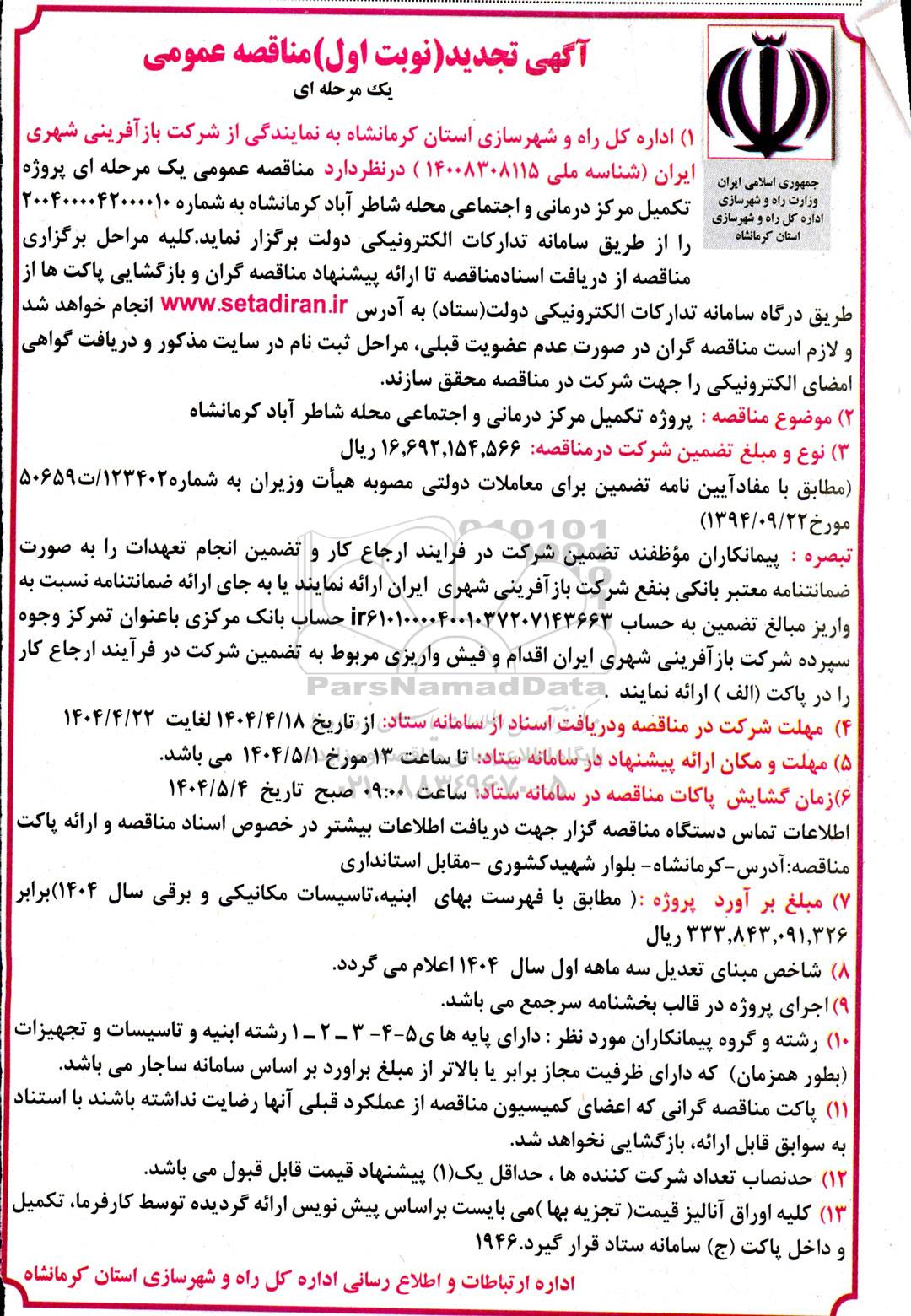 (۱) اداره کل راه و شهرسازی استان کرمانشاه به نمایندگی از شرکت بازافرینی شهری ایران شناسه ملی 14008308115 در نظر دارد مناقصه عمومی یک مرحله ای پروژه تکمیل مرکز درمانی و اجتماعی محله شاطرآباد کرمانشاه به شماره 2004000042000010 را از طریق سامانه تدارکات الکترونیکی دولت برگزار نماید. کلیه مراحل برگزاری مناقصه از دریافت اسناد مناقصه تا ارائه پیشنهاد مناقصه گران و بازگشایی پاکتها از طریق درگاه سامانه تدارکات الکترونیکی دولت (ستاد) ایران انجام خواهد شد و لازم است مناقصه گران در صورت عدم عضویت قبلی مراحل ثبت نام در سایت مذکور و دریافت گواهی امضای الکترونیکی را جهت شرکت در مناقصه محقق سازند.