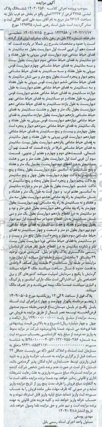 مزایده ششدانگ پلاک ثبتی 3785 فرعی از 2327 اصلی