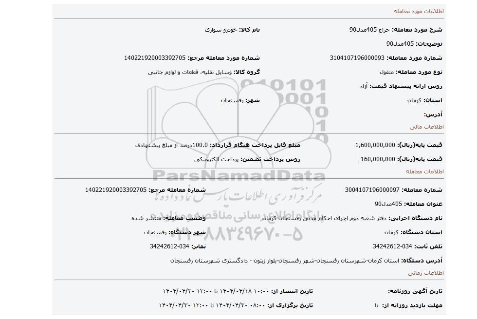 | شرح مورد معامله: حراج 405مدل90 | نام کالا: خودرو سواری | |