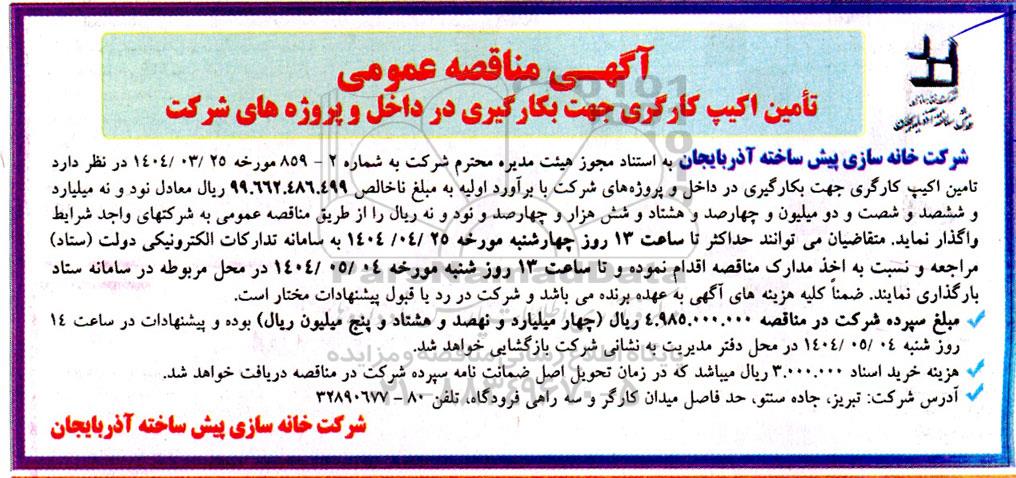 شرکت خانه سازی پیش ساخته آذربایجان به استناد مجوز هیئت مدیر عامل محترم شرکت به شماره 2-859 مورخه 1404.03.25 در نظر دارد تامین اکیپ کارگری جهت بکارگیری در داخل و پروژه های شرکت با برآورد اولیه به مبلغ ناخالص 99.662.486.499 ریال معادل (نود و نه میلیارد و ششصد و شصت و دو میلیون و چهارصد و هشتاد و شش هزار و چهارصد و نود و نه ریال) را از طریق مناقصه عمومی به شرکت های واجد شرایط واگذار نماید.