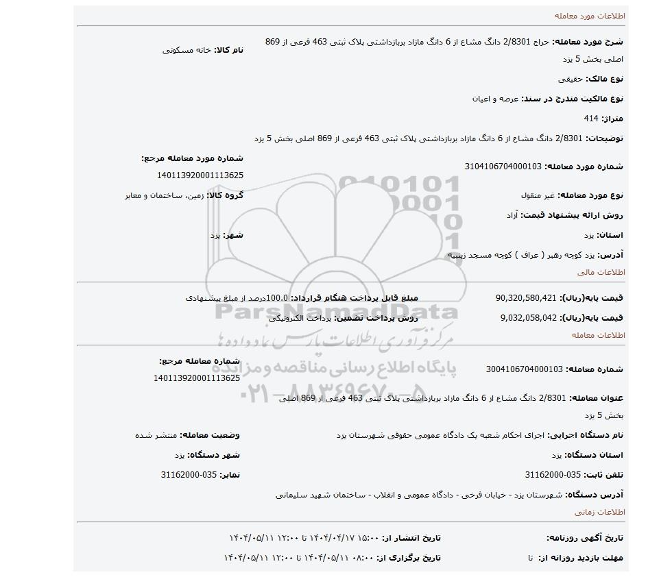| عنوان معامله: 2/8301 دانگ مشاع از 6 دانگ مازاد بربازداشتی پلاک ثبتی 463 فرعی از 869 اصلی بخش 5 یزد | ||