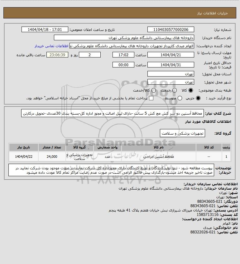 | 1 | -- | محافظ آستین جراحی | عدد | تجهیزات پزشکی و سلامت | 24,000 | 1404/04/22 |