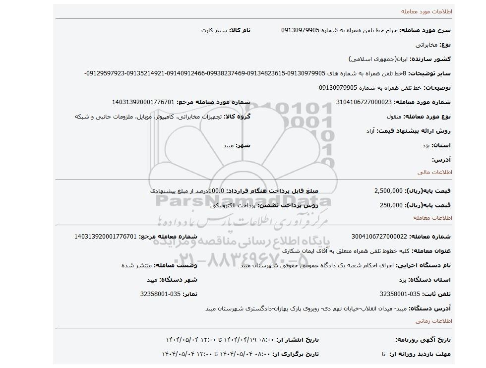 | شرح مورد معامله: حراج خط تلفن همراه به شماره 09130979905 | نام کالا: سیم کارت | |
