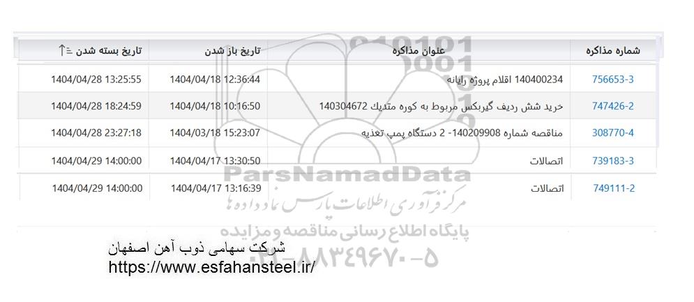 | 308770-4 | مناقصه شماره 2140209908 دستگاه پمپ تغذیه | 1404.4.28 |