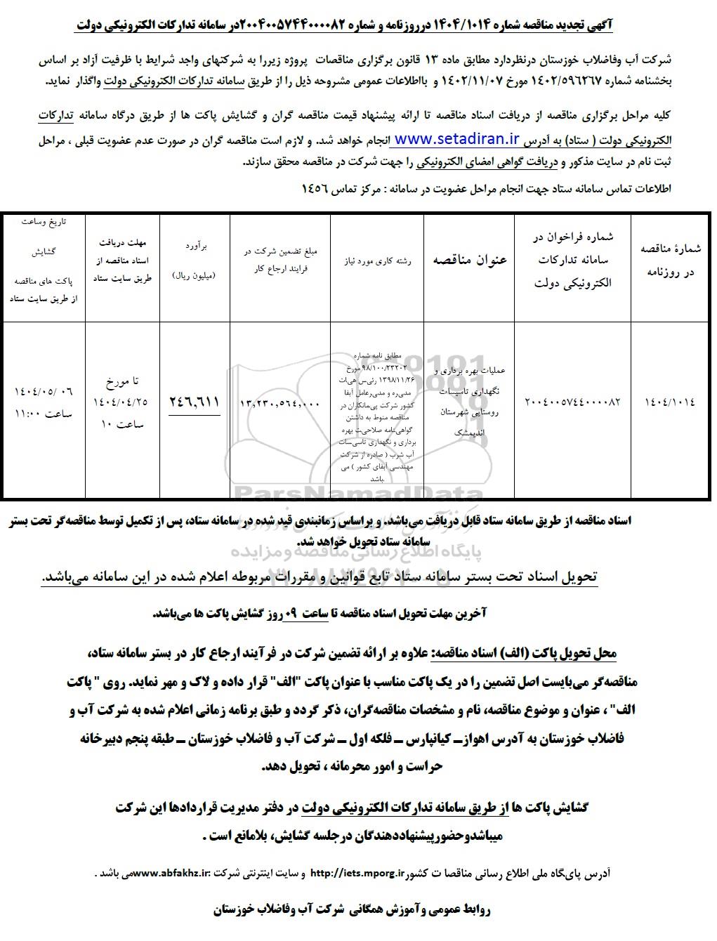 | 1404.1014 | 2004005744000082 | عملبیات بهره برداری و نگهداری تاسیسات شهرستان اندیمشک | مطابق نامه شماره 98/100/23202 مورخ 1398.11.26 رئیس هیات مدیره و مدیرعامل آبفا کشور شرکت پیمانکاران در مناقصه منوط به داشتن گواهینامه صلاحیت بهره برداری و نگهداری تاسیسات آب شرب (صادره از شرکت مهندسی آبفای کشور) می باشد. | 13.230.564.000 | 246.611 | تا مورخ 1404.4.25 ساعت 10 | 1404.5.6 ساعت 11 |