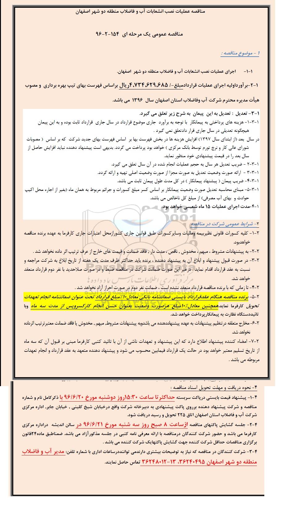 موضوع مناقصه: اجرای عملیات نصب انشعابات آب و فاضلاب منطقه دو شهر اصفهان