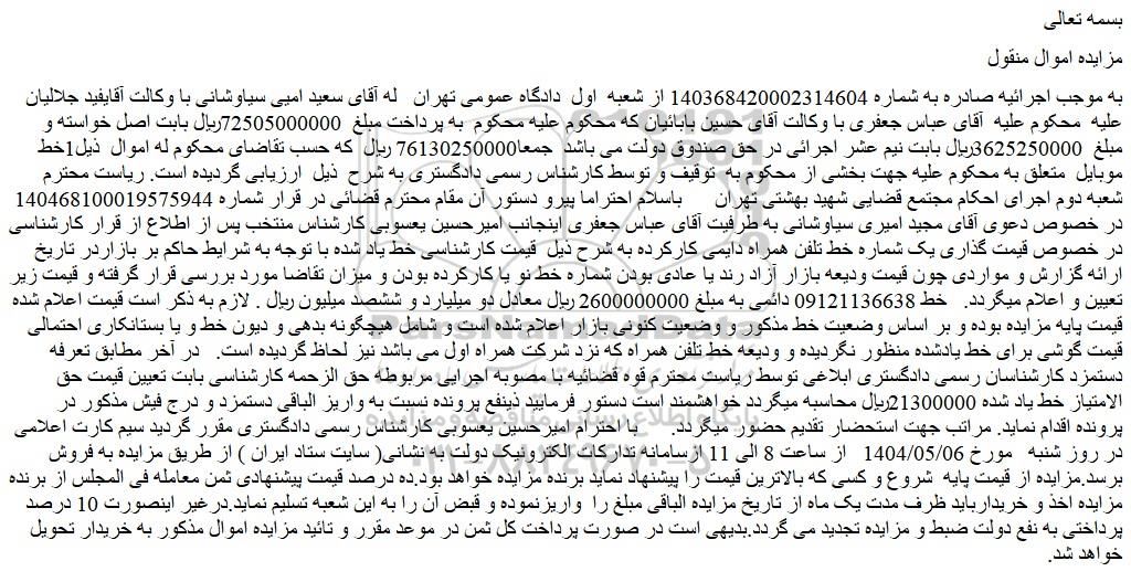 به موجب اجرائیه صادره به شماره 140368420002314604 از شعبه اول دادگاه عمومی تهران له آقای سعید امیی سیاوشانی با وکالت آقایفید جلالیان علیه محکوم علیه آقای عباس جعفری با وکالت آقای حسین بابائیان که محکوم علیه محکوم به پرداخت مبلغ 72505000000ریال بابت اصل خواسته و مبلغ 3625250000ریال بابت نیم عشر اجرائی در حق صندوق دولت می باشد جمعا76130250000 ریال که حسب تقاضای محکوم له اموال ذیل1خط موبایل متعلق به محکوم علیه جهت بخشی از محکوم به توقیف و توسط کارشناس رسمی دادگستری به شرح ذیل ارزیابی گردیده است. ریاست محترم شعبه دوم اجرای احکام مجتمع قضایی شهید بهشتی تهران باسلام احتراما پیرو دستور آن مقام محترم قضائی در قرار شماره 140468100019575944 در خصوص دعوی آقای مجید امیری سیاوشانی به طرفیت آقای عباس جعفری اینجانب امیرحسین یعسوبی کارشناس منتخب پس از اطلاع از قرار کارشناسی در خصوص قیمت گذاری یک شماره خط تلفن همراه دایمی کارکرده به شرح ذیل قیمت کارشناسی خط یاد شده با توجه به شرایط حاکم بر بازاردر تاریخ ارائه گزارش و مواردی چون قیمت ودیعه بازار آزاد رند یا عادی بودن شماره خط نو یا کارکرده بودن و میزان تقاضا مورد بررسی قرار گرفته و قیمت زیر تعیین و اعلام میگردد. خط 09121136638 دائمی به مبلغ 2600000000 ریال معادل دو میلیارد و ششصد میلیون ریال . لازم به ذکر است قیمت اعلام شده قیمت پایه مزایده بوده و بر اساس وضعیت خط مذکور و وضعیت کنونی بازار اعلام شده است و شامل هیچگونه بدهی و دیون خط و یا بستانکاری احتمالی قیمت گوشی برای خط یادشده منظور نگردیده و ودیعه خط تلفن همراه که نزد شرکت همراه اول می باشد نیز لحاظ گردیده است. در آخر مطابق تعرفه دستمزد کارشناسان رسمی دادگستری ابلاغی توسط ریاست محترم قوه قضائیه با مصوبه اجرایی مربوطه حق الزحمه کارشناسی بابت تعیین قیمت حق الامتیاز خط یاد شده 21300000ریال محاسبه میگردد خواهشمند است دستور فرمایید ذینفع پرونده نسبت به واریز الباقی دستمزد و درج فیش مذکور در پرونده اقدام نماید. مراتب جهت استحضار تقدیم حضور میگردد. با احترام امیرحسین یعسوبی کارشناس رسمی دادگستری مقرر گردید سیم کارت اعلامی در روز شنبه مورخ 1404/05/06 از ساعت 8 الی 11 ازسامانه تدارکات الکترونیک دولت به نشانی( سایت ستاد ایران ) از طریق مزایده به فروش برسد.مزایده از قیمت پایه شروع و کسی که بالاترین قیمت را پیشنهاد نماید برنده مزایده خواهد بود.ده درصد قیمت پیشنهادی ثمن معامله فی المجلس از برنده مزایده اخذ و خریدارباید ظرف مدت یک ماه از تاریخ مزایده الباقی مبلغ را واریزنموده و قبض آن را به این شعبه تسلیم نماید.درغیر اینصورت 10 درصد پرداختی به نفع دولت ضبط و مزایده تجدید می گردد.بدیهی است در صورت پرداخت کل ثمن در موعد مقرر و تائید مزایده اموال مذکور به خریدار تحویل خواهد شد.