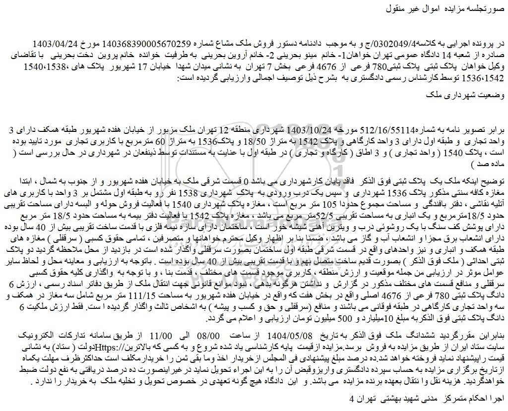 در پرونده اجرایی به کلاسه0302049/4/ج و به موجب دادنامه دستور فروش ملک مشاع شماره 140368390005670259 مورخ 1403/04/24 صادره از شعبه 14 دادگاه عمومی تهران خواهان1- خانم مینو بحرینی 2- خانم آروین بحرینی به طرفیت خوانده خانم پروین دخت بحرینی با تقاضای وکیل خواهان پلاک ثبتی پلاک ثبتی780 فرعی از 4676 فرعی بخش 7 تهران به نشانی میدان شهدا خیابان 17 شهریور پلاک های 1540،1538،1536،1542 توسط کارشناس رسمی دادگستری به بشرح ذیل توصیف اجمالی وارزیابی گردیده است: