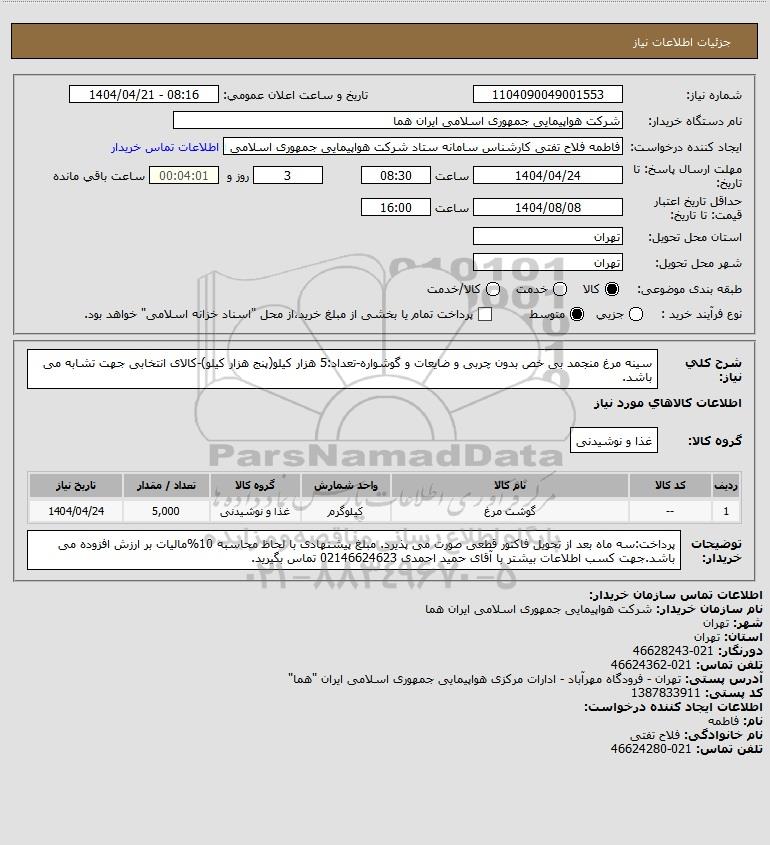 شرح کلی نیاز: سینه مرغ منجمد بی خص بدون چربی و ضایعات و گوشواره-تعداد:5 هزار کیلو(پنج هزار کیلو)-کالای انتخابی جهت تشابه می باشد.
