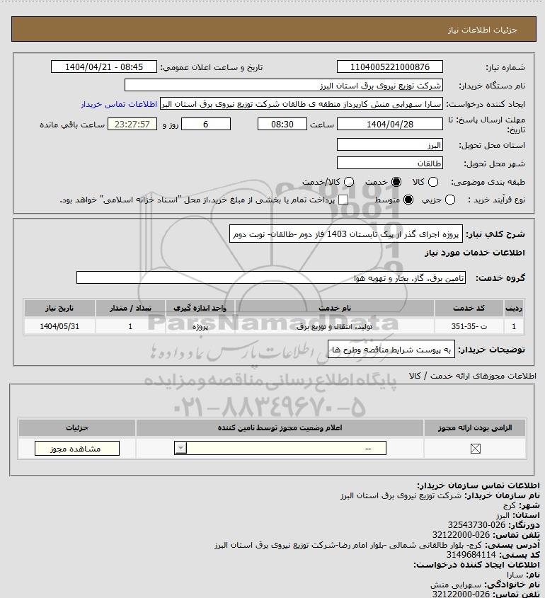 شرح کلی نیاز: پروژه اجرای گذر از پیک تابستان 1403 فاز دوم -طالقان- نوبت دوم