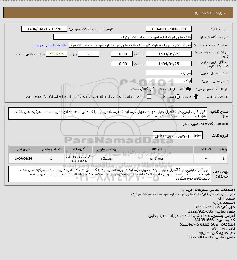 شرح کلی نیاز: کولر گازی اینورتردار 30هزار چهار جهته -تحویل درساوه شهرستان زرندیه بانک ملی شعبه مامونیه زرند استان مرکزی می باشد. هزینه حمل رایگان است.نقدی می باشد.