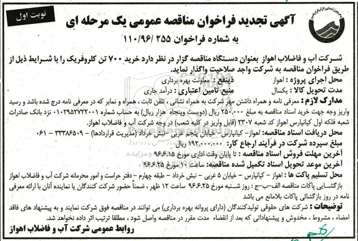 تجدید مناقصه خرید 700 تن کلروفریک , آگهی تجدید فراخوان مناقصه عمومی یک مرحله ای، مناقصه خرید 700 تن کلروفریک