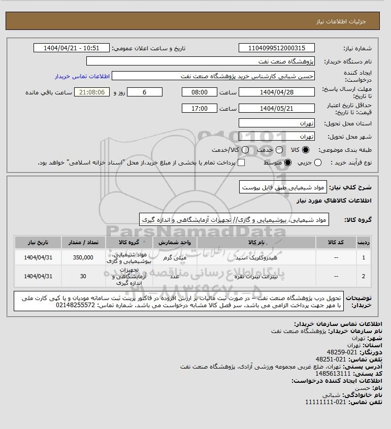 شرح کلی نیاز: مواد شیمیایی طبق فایل پیوست