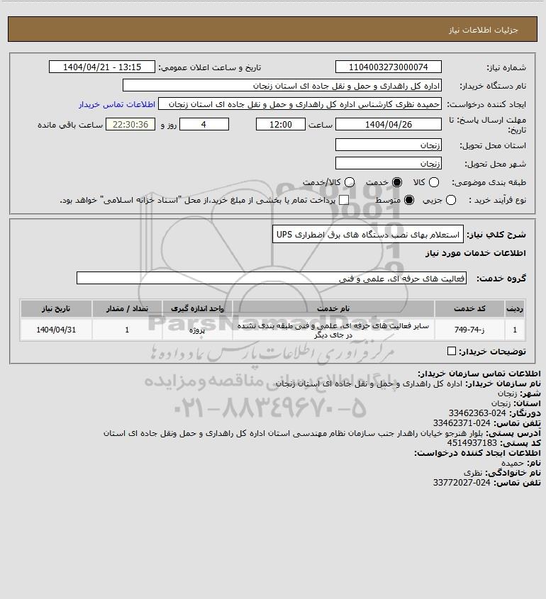 شرح کلی نیاز: استعلام بهای نصب دستگاه های برق اضطراری UPS