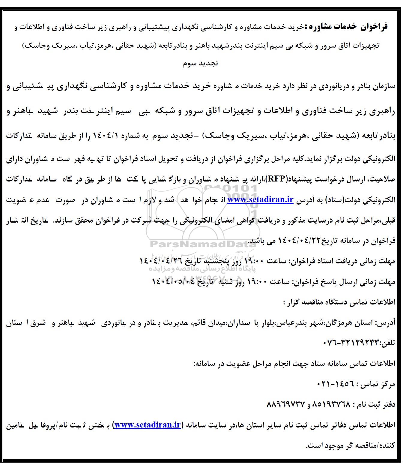 فراخوان خدمات مشاوره : خرید خدمات مشاوره و کارشناسی نگهداری پیشتیبانی و راهبری زیر ساخت فناوری و اطلاعات و تجهیزات اتاق سرور و شبکه بی سیم اینترنت بندر شهید باهنر و بنادر تابعه (شهید حقانی، هرمز، تیاب، سیریک و جاسک) تجدید سوم