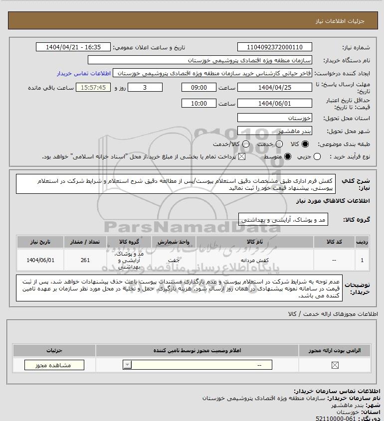 شرح کلی نیاز: کفش فرم اداری طبق مشخصات دقیق استعلام پیوست/پس از مطالعه دقیق شرح استعلام و شرایط شرکت در استعلام پیوستی، پیشنهاد قیمت خود را ثبت نمائید