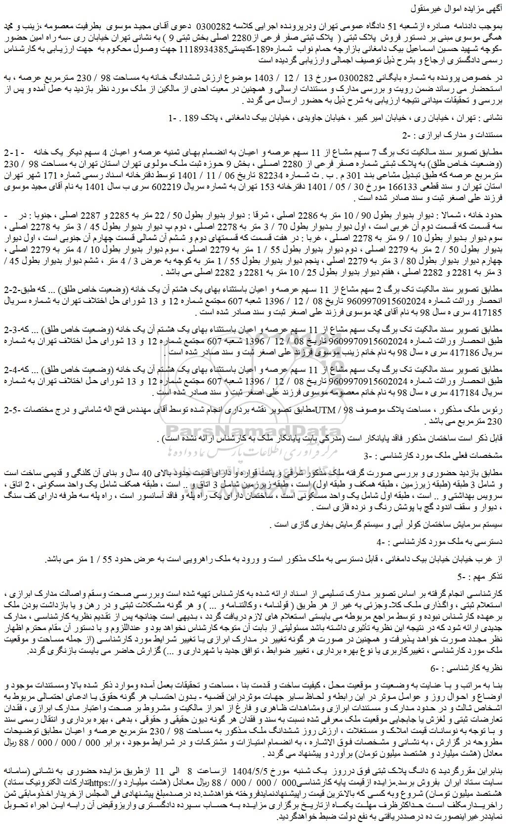 بموجب دادنامه  صادره ازشعبه 51 دادگاه عمومی تهران ودرپرونده اجرایی کلاسه 0300282  دعوی آقای مجید موسوی  بطرفیت معصومه ،زینب و محمد همگی موسوی مبنی بر دستور فروش  پلاک ثبتی (  پلاک ثبتی صفر فرعی از2280 اصلی بخش ثبتی 9 ) به نشانی تهران خیابان ری -سه راه امین حضور -کوچه شهید حسین اسماعیل بیک دامغانی بازارچه حمام نواب  شماره189-کدپستی1118934385 جهت وصول محکوم به  جهت ارزیابی به کارشناس رسمی دادگستری ارجاع و بشرح ذیل توصیف اجمالی وارزیابی گردیده است