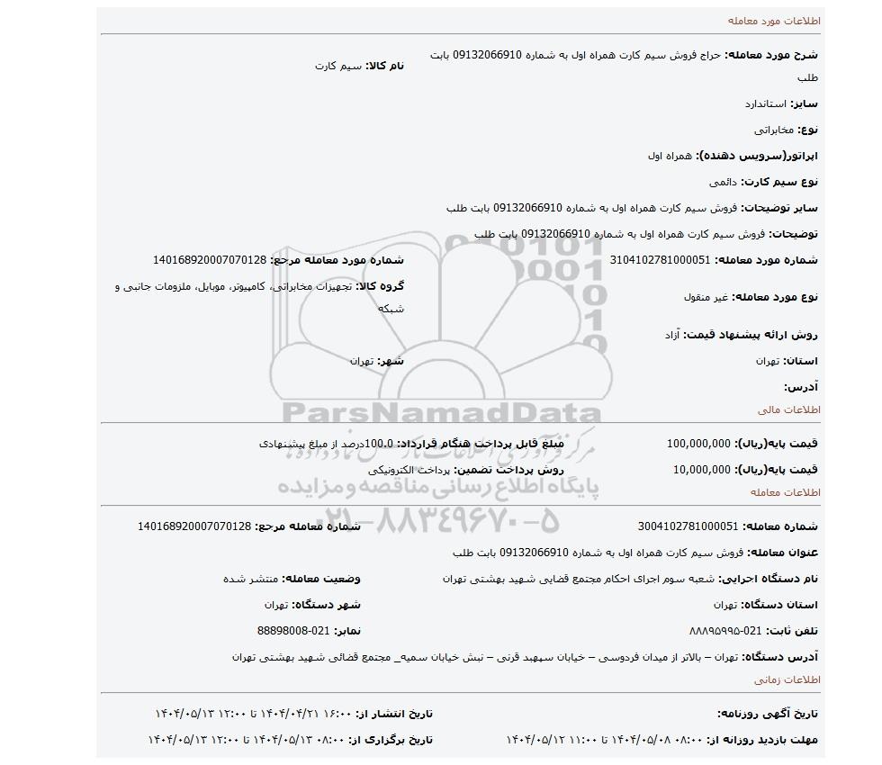 | عنوان معامله: فروش سیم کارت همراه اول به شماره 09132066910 بابت طلب | ||