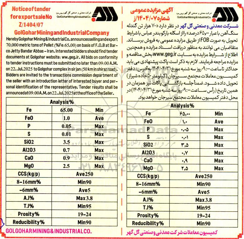 شرکت معدنی و صنعتی گل گهر در نظر دارد «70 هزار تن گندله سنگ آهن با عیار 65.000 درصد» را از اسکله بارکو بندرعباس با شرایط تحویل به صورت FOB از طریق مزایده عمومی به فروش برساند. متقاضیان می توانند به منظور دریافت اسناد مزایده و همچنین اطلاع از شرایط مزایده به سایت www.geg.ir بخش مناقصه و مزایده مراجعه فرمایند. لازم به ذکر است پاکت پیشنهادی می باید حداکثر تا ساعت 9:00 روز سه شنبه مورخ 1404.04.31 به آدرس: دفتر کمیسیون، معاملات مجتمع سیرجان (کیلومتر 50 جاده شیراز) تحویل داده شود. ضمنا جلسه بازگشایی پاکات نیز همزمان در همین تاریخ (راس ساعت 9:00 روز سه شنبه مورخ 1404.04.31) در محل دفتر کمیسیون معاملات مجتمع سیرجان خواهد بود.