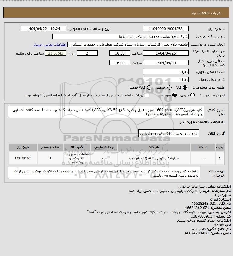 1 -- مدارشکن هوایی ACB (کلید هوایی) عدد قطعات و تجهیزات الکتریکی و روشنایی 1 1404/04/25