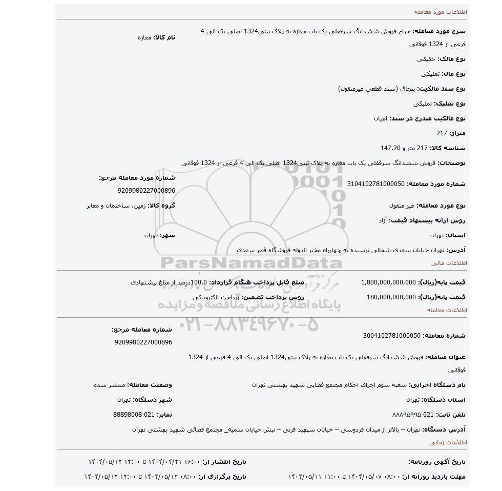 | شماره مورد معامله: 3104102781000050 | شماره مورد معامله مرجع: 9209980227000896 | |