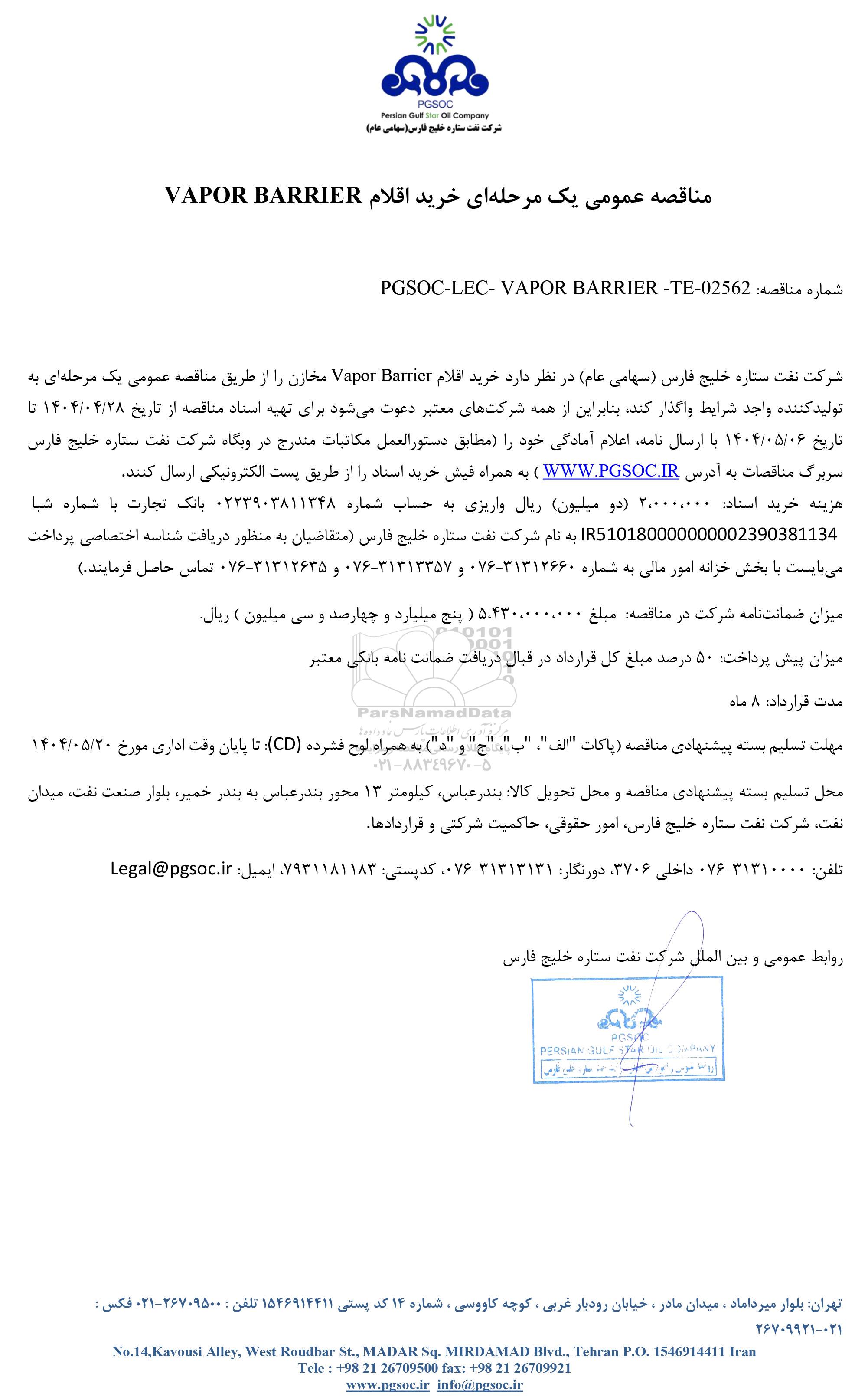 شرکت نفت ستاره خلیج فارس (سهامی عام) در نظر دارد خرید اقلام Vapor Barrier مخازن را از طريق مناقصه عمومی یک مرحلهای به تولیدکننده واجد شرايط واگذار کند، بنابراین از همه شرکتهای معتبر دعوت میشود برای تهیه اسناد مناقصه از تاریخ 1404.04.28 تا تاریخ 1404.05.06 با ارسال نامه، اعلام آمادگی خود را (مطابق دستورالعمل مکاتبات مندرج در وبگاه شرکت نفت ستاره خلیج فارس سربرگ مناقصات به آدرس WWW.PGSOC.IR ) به همراه فیش خرید اسناد را از طریق پست الکترونیکی ارسال کنند.
