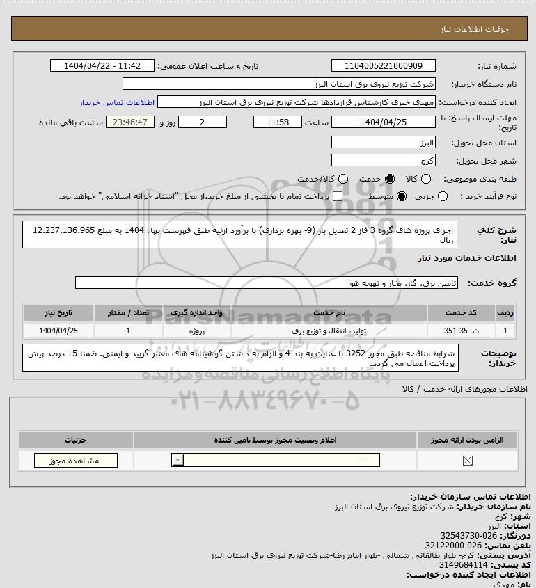 شرح کلی نیاز: اجرای پروژه های گروه 3 فاز 2 تعدیل بار (9- بهره برداری) با برآورد اولیه طبق فهرست بهاء 1404 به مبلغ 12.237.136.965 ریال