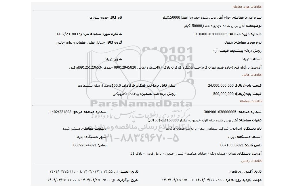 عنوان معامله: آهن پرس شده بدنه انواع خودرو به مقدار 150000کیلو (150تن)