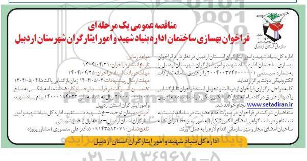 مناقصه عمومی یک مرحله ای بهسازی سالن اجتماعات ساختمان اداری بنیاد شهید و امور ایثارگران شهرستان اردبیل ؟