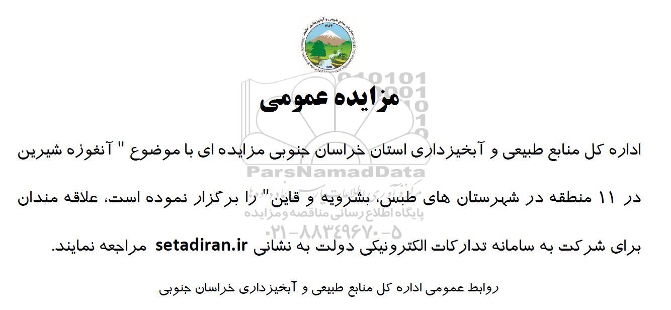 اداره کل منابع طبیعی و آبخیزداری استان خراسان جنوبی مزایده ای با موضوع آنغوزه شیرین در 11 منطقه شهرستان های طبس، بشرویه،قاین را برگزار نموده است علاقه مندان برای شرکت به سامانه تدارکات الکترونیکی دولت مراجعه نمایند.