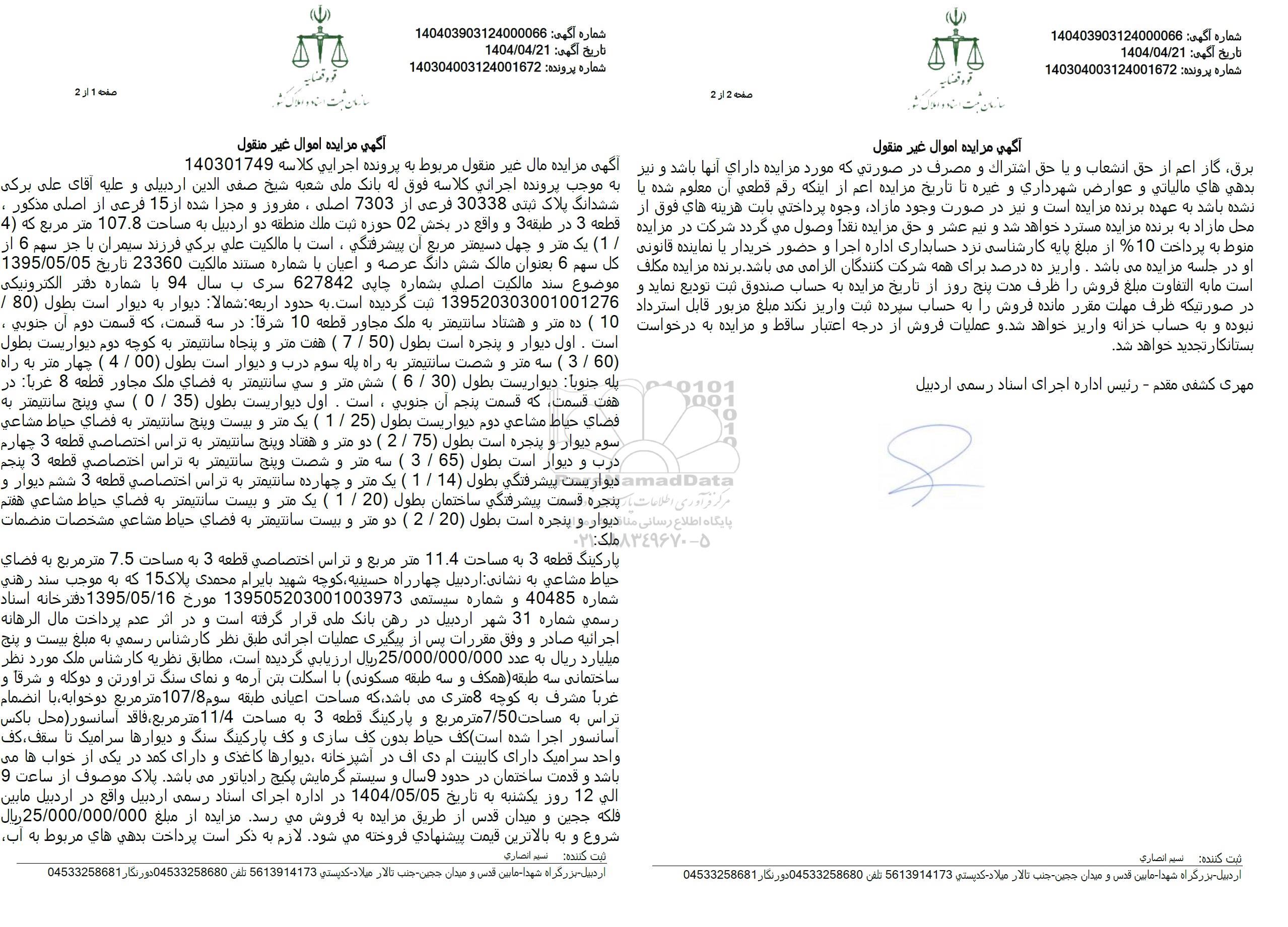 اگهی مزایده اموال غیرمنقول