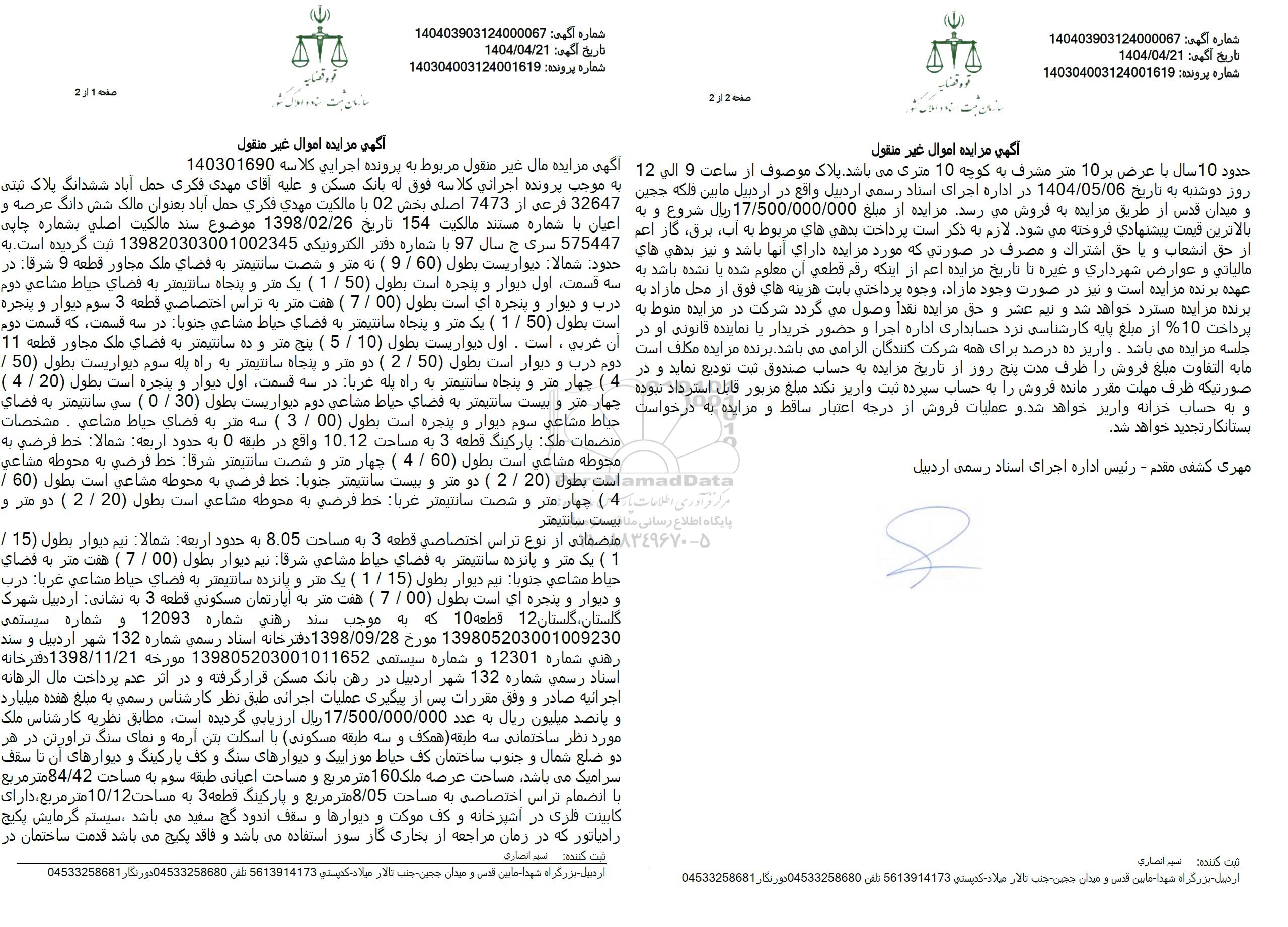 مزایده فروش پلاک ثبتی 32647 فرعی از 7473 اصلی به مبلغ 17.500.000.000 ریال
