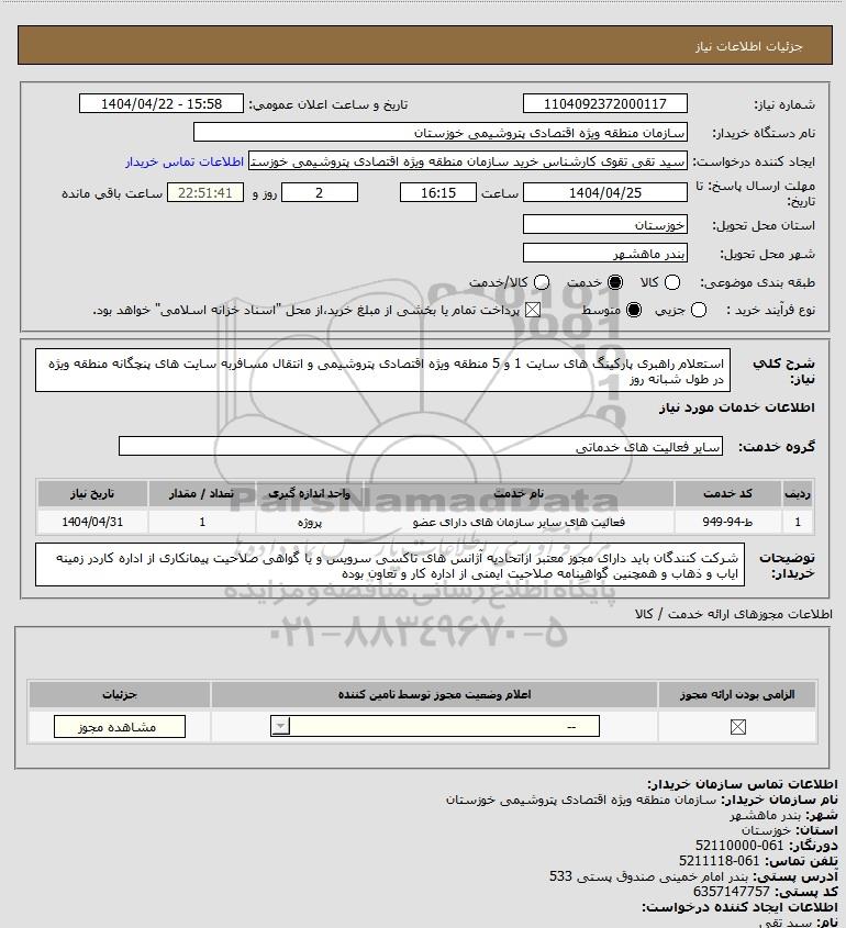 استعلام استعلام راهبری پارکینگ های سایت 1 و 5 منطقه ویژه اقتصادی پتروشیمی و انتقال مسافربه سایت های پنچگانه منطقه ویژه در طول شبانه روز, استعلام استعلام راهبری پارکینگ های سایت 1 و 5 منطقه ویژه اقتصادی پتروشیمی و انتقال مسافربه سایت های پنچگانه منطقه ویژه در طول شبانه روز