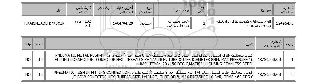 | 52496475 | انواع شیرها واکچویتورهای ابزاردقیقی وقطعات مربوطه | 2 | خرید تجهیزات وقطعات یدکی | استانی | 1404/04/29 | توفیق کریم زاده | T.KARIMZADEH@KSC.IR |
