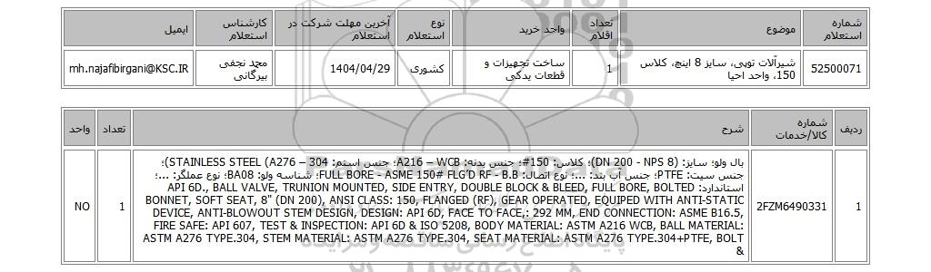 | 52500071 | شیرآلات توپی، سایز 8 اینچ، کلاس 150، واحد احیا | 1 | ساخت تجهیزات و قطعات یدکی | کشوری | 1404/04/29 | محمد نجفی بیرگانی | mh.najafibirgani@KSC.IR |