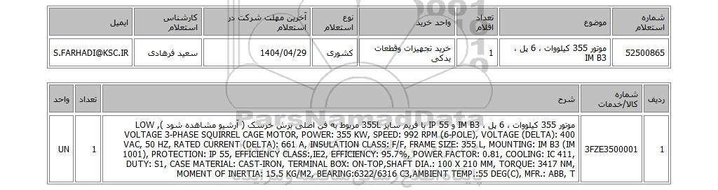 52500865موتور 355 کیلووات ، 6 پل ، IM B3 1خرید تجهیزات وقطعات یدکیکشوری1404/04/29سعید فرهادیS.FARHADI@KSC.IR