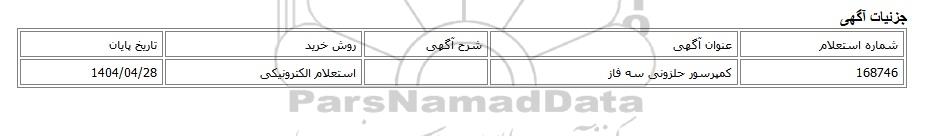 | 168746 | کمپرسور حلزونی سه فاز | استعلام الکترونیکی | 1404/04/28 |