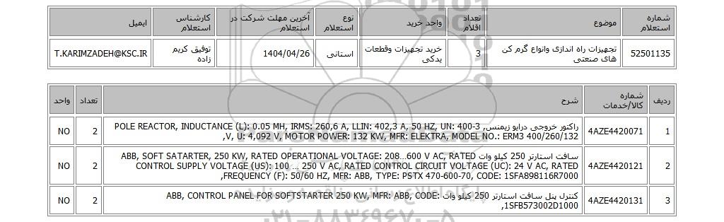 52501135تجهیزات راه اندازی وانواع گرم کن های صنعتی3خرید تجهیزات وقطعات یدکیاستانی1404/04/26توفیق کریم زادهT.KARIMZADEH@KSC.IR