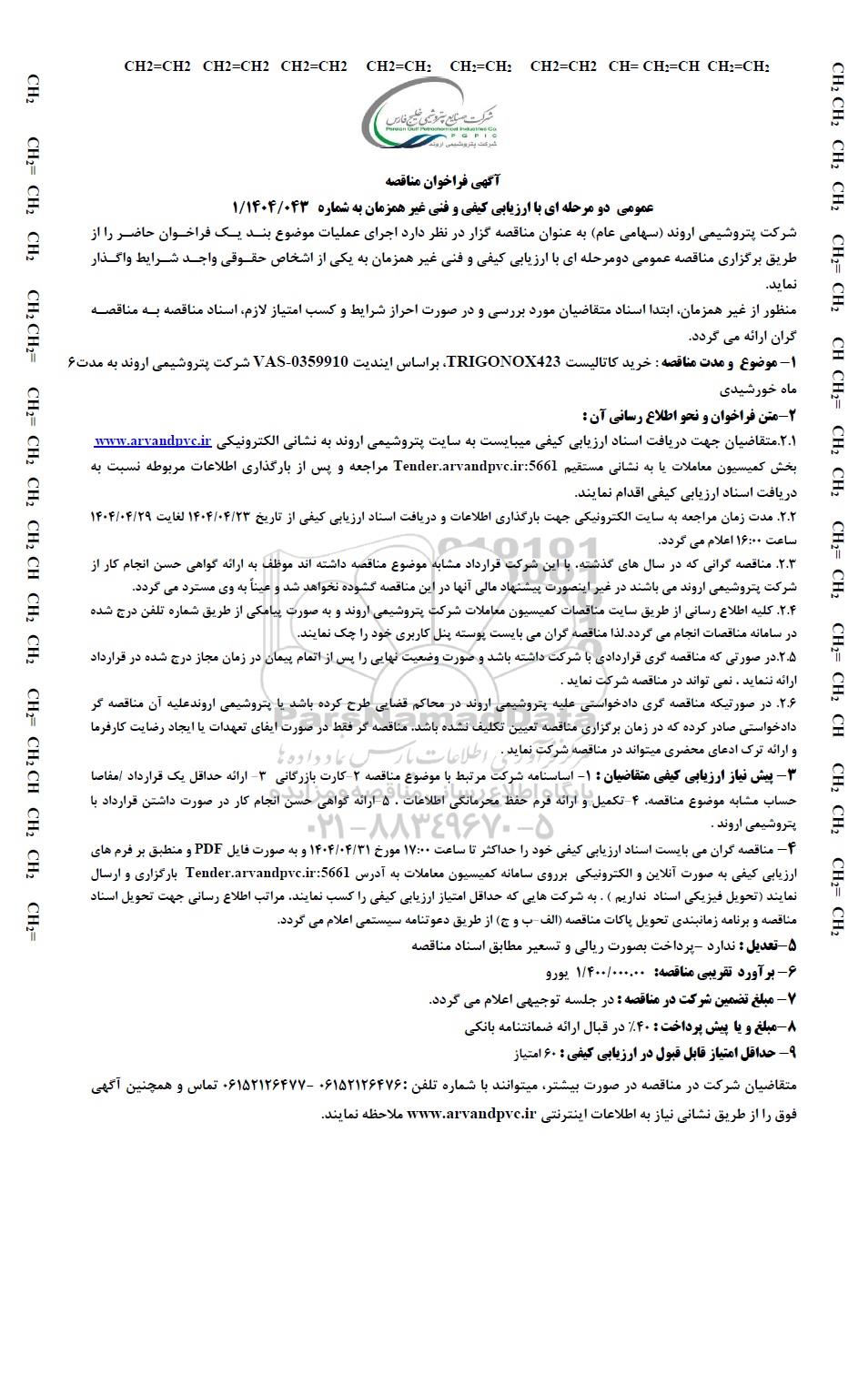 1- موضوع و مدت مناقصه : خرید کاتالیست TRIGONOX423 ، براساس ایندیت VAS- 0359910 شرکت پتروشیمی اروند به مدت6 ماه خورشیدی