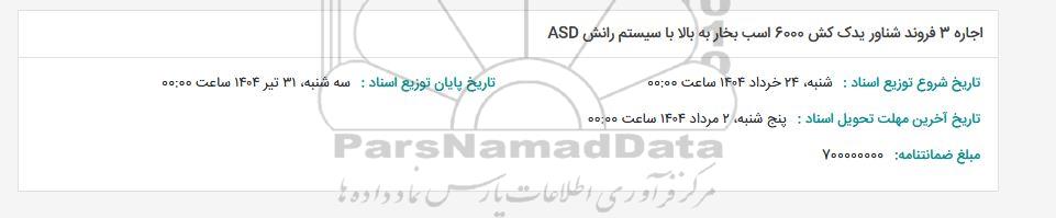 علاقه‌مندان می‌توانند جهت دریافت اسناد و اطلاعات تکمیلی، مناقصه اجاره 3 فروند شناور یدک کش 6000 اسب بخار به بالا با سیستم رانش ASD با سامانه مناقصات و مزایدات ایران پارس‌نماد داده ها 88349670 تماس حاصل نمایند.